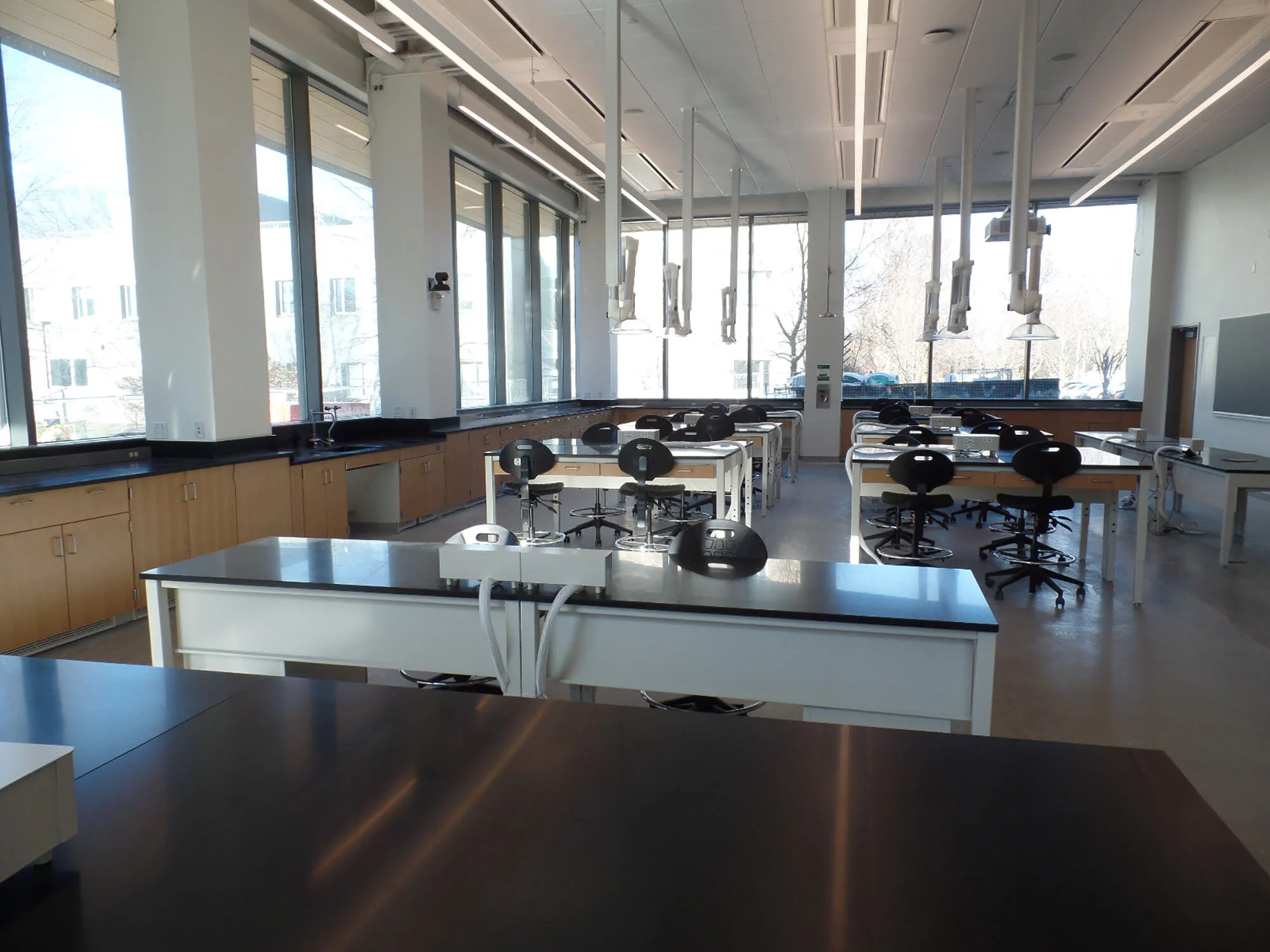 A large biology classroom in Singer Hall is bathed in natural light. Photo by Robert Richardson.