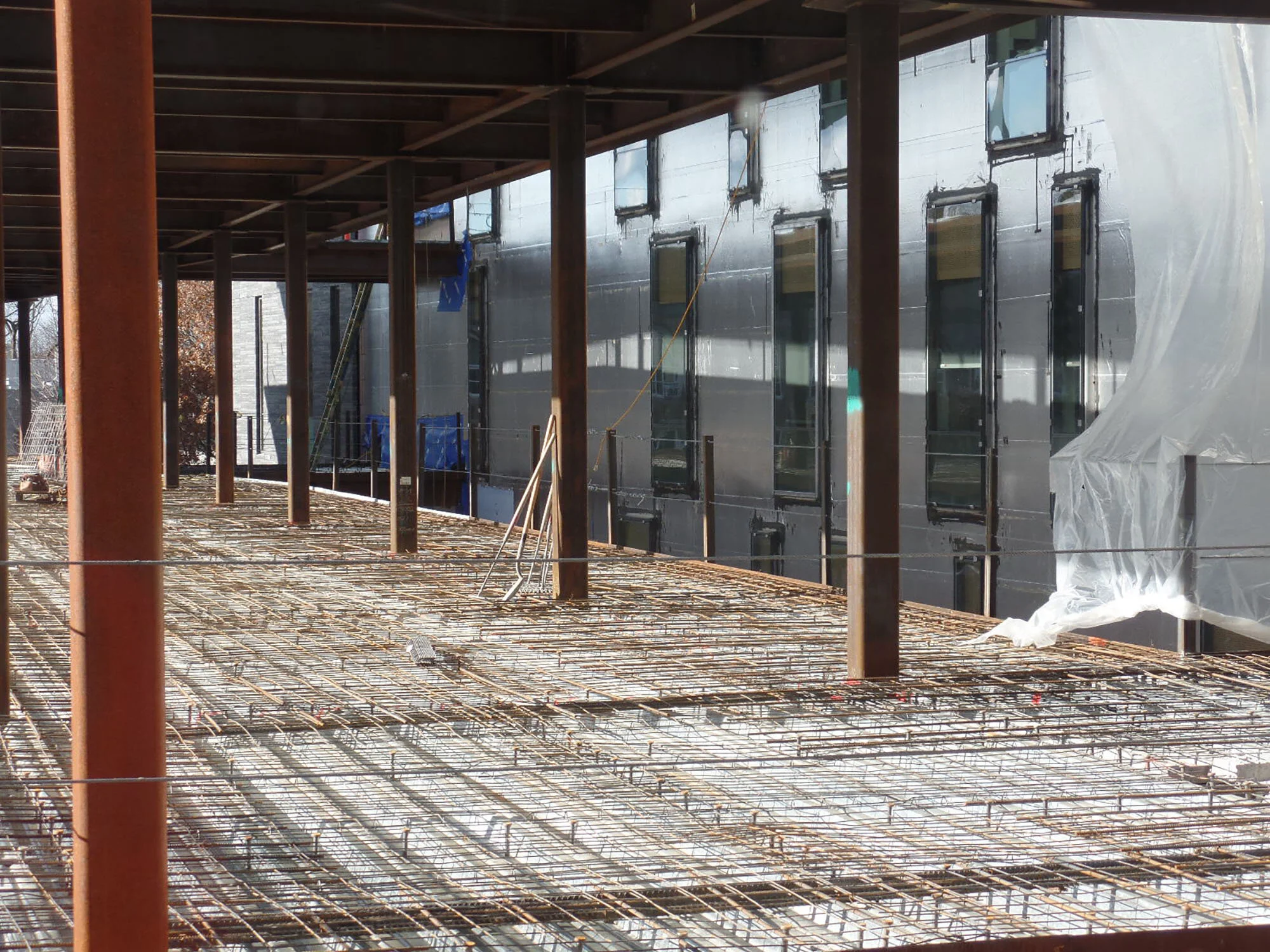 Beams and rebar outline the shape of Phase II construction of Swarthmore College’s new Singer Hall. The wall behind them is part of the building’s finished first phase. The windows here will eventually look out into a glass-covered atrium inside the building. Photo by Robert Richardson.