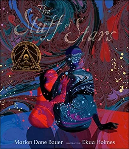 This is from “The Stuff of Stars,” by Marion Dane Bauer (illustrated by Ekua Holmes), which was given to my family by friends after we lost someone very dear to us. When someone experiences a loss, there is often an outpouring of food (baked goods are my go-to), so I was surprised when my friends handed me a gift bag, with tissue paper just barely obscuring the book inside. But it was perfect.