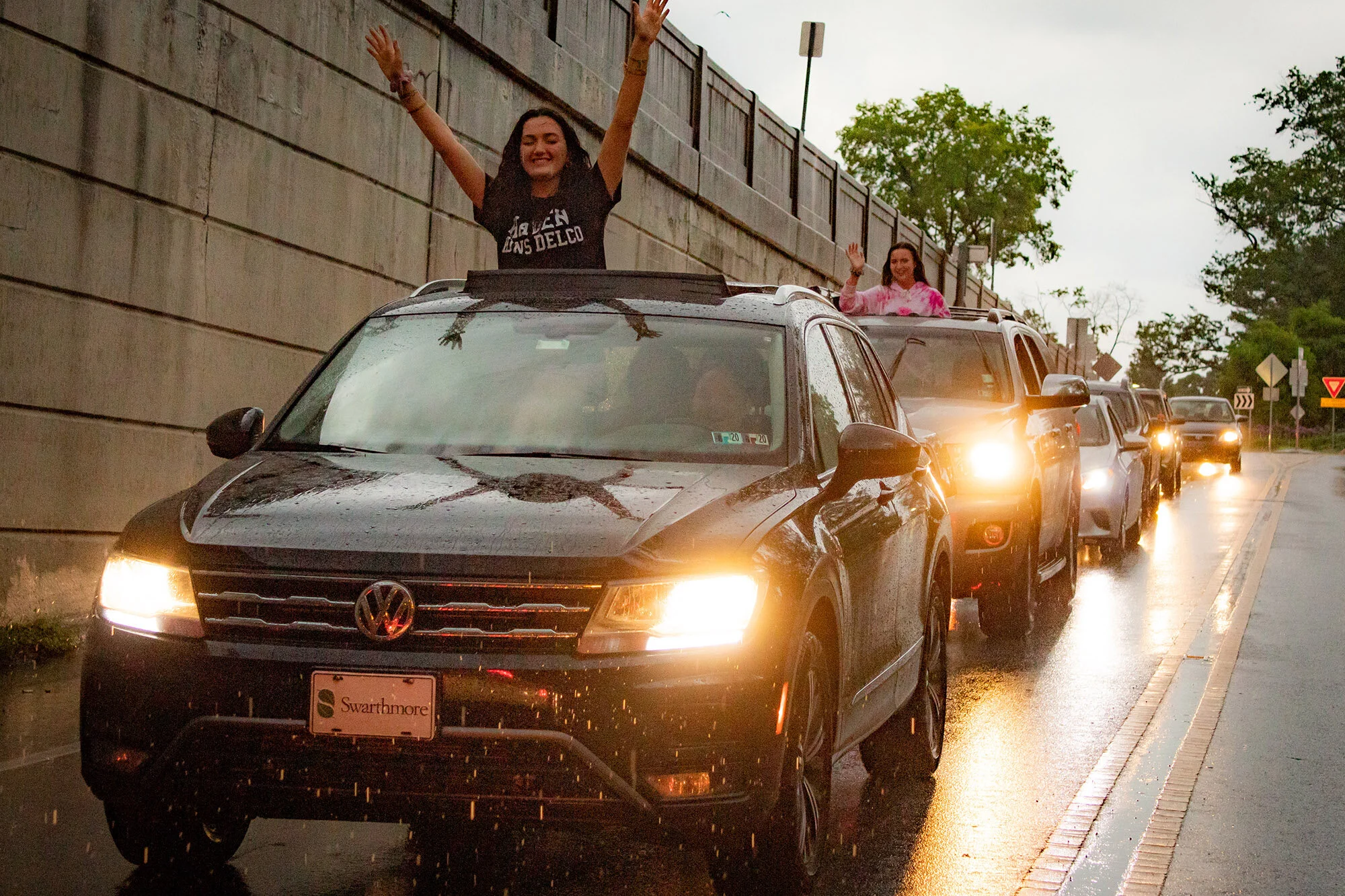 At 7 p.m., under a torrent of rain, a car parade of excited graduates departed from the high school parking lot, then wound its way through Wallingford, Swarthmore, Rutledge, South Media, and back to the high school again, while well wishers cheered and waved their umbrellas.