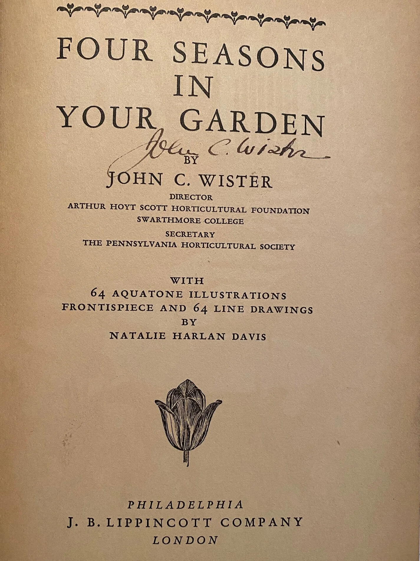 Every true Swarthmorean should own a copy of Dr. John Wister’s “Four Seasons in Your Garden” (J.B. Lippincott Company) — if they can find one. Dr. Wister was the first director of the Scott Arboretum at Swarthmore College (1929-69). In his introduction, he writes, “This book is for all who love gardening; but its first purpose is to interest those who plan to beautify rather small grounds.” He continues, “...many modern books are so complicated they tend to discourage the would-be gardener at the start.”